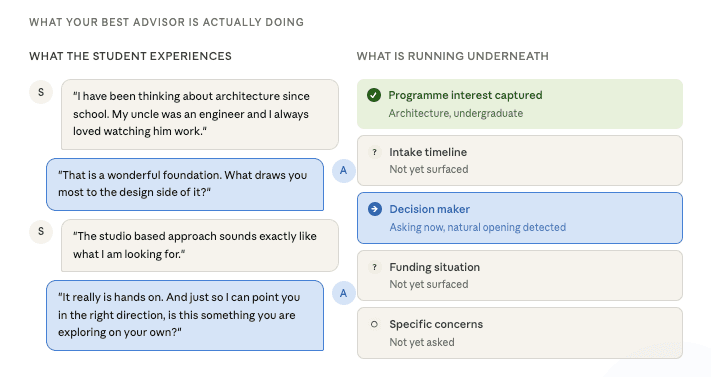 For that to work, the AI needs to behave in a way that reflects well on your institution. It needs to ask the right questions at the right moments. It needs to remember what has already been said. It needs to know when to push and when to listen. In other words, it needs to do what your best advisor does, just at a scale and availability that no human team can match alone.