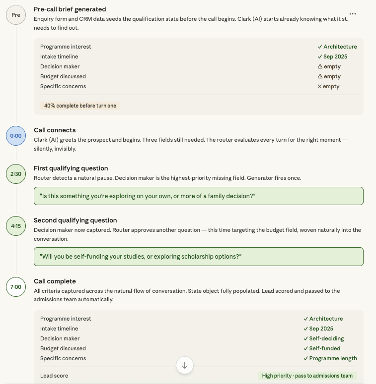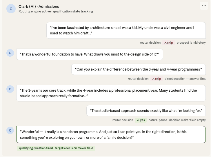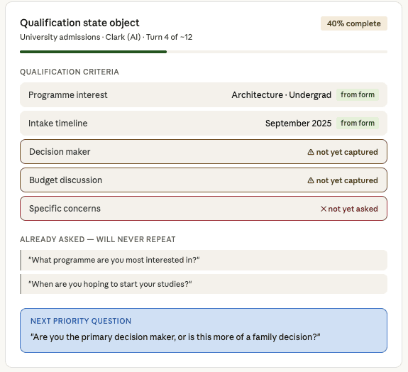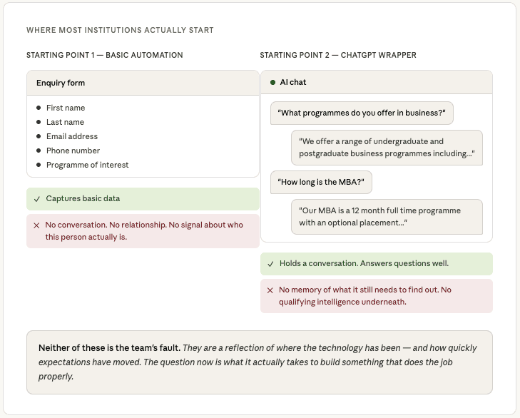 The second is a ChatGPT-style wrapper, a language model that can hold a conversation but has not been built with any qualifying intelligence underneath it. It can answer questions about programmes. It can sound friendly and helpful. But it has no memory of what it still needs to find out, no sense of whether this is the right moment to ask, and no structured understanding of what a qualified prospect actually looks like for that institution. It talks well. It qualifies poorly.