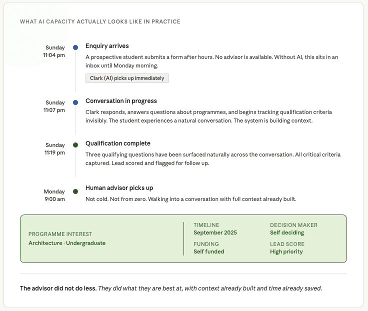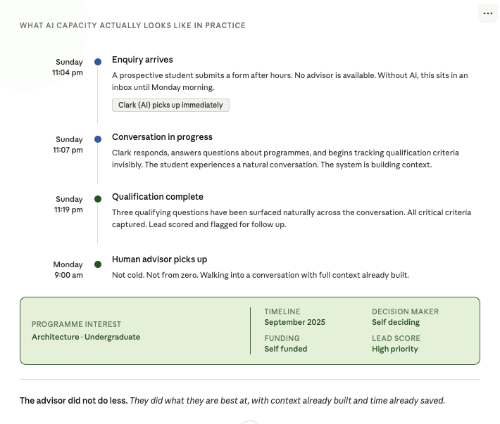 That is the practical outcome of getting the architecture right. Not a smarter chatbot. A genuine extension of your admissions capacity, built to the standard your best advisors have already set.