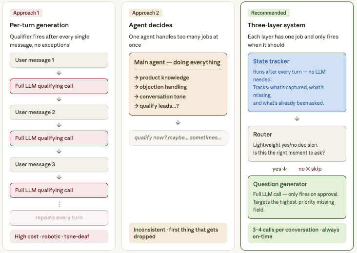 But that is not what a great admissions advisor is doing. They are running a goal tracking system. They know exactly what they need to find out. They know what they already know. And they are choosing the right moment for every single question based on a real-time reading of the conversation. That insight is what led us to a third approach, and to the three-layer architecture we now build around.